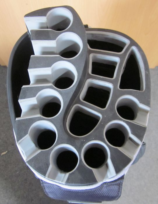 The Longridge Eze Kaddy pro is an extra tall cart bag (39.4”) that features a 9.5” (24cm) top with two tiered design to keep the clubs organised. It is manufactured from a lightweight material and offers a 15-way divider system. The cart bag is equipped with a special 'V’ slot top that keeps the clubs in place and eliminates rattling. In addition, it has 10 easy access pockets and side lift handles for easy transportation.