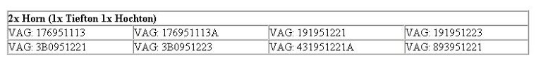 | Bezeichnung | Motorisierung | Baujahr | KW | PS | ccm | KBA | Einschränkung |