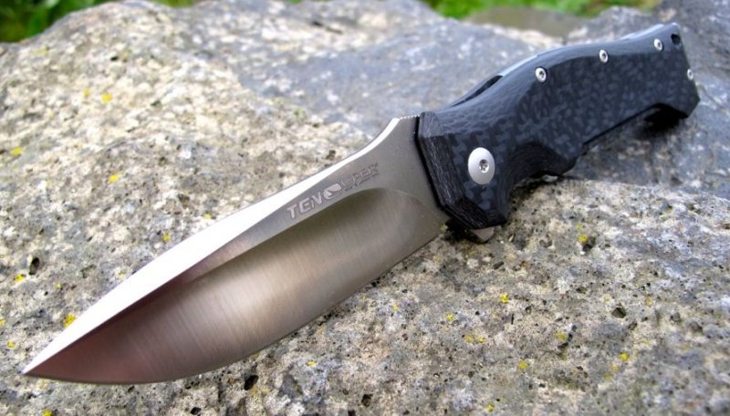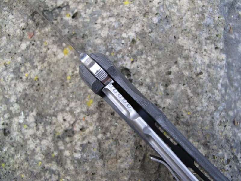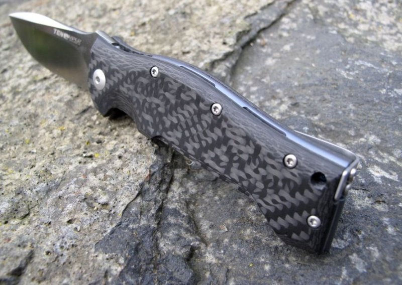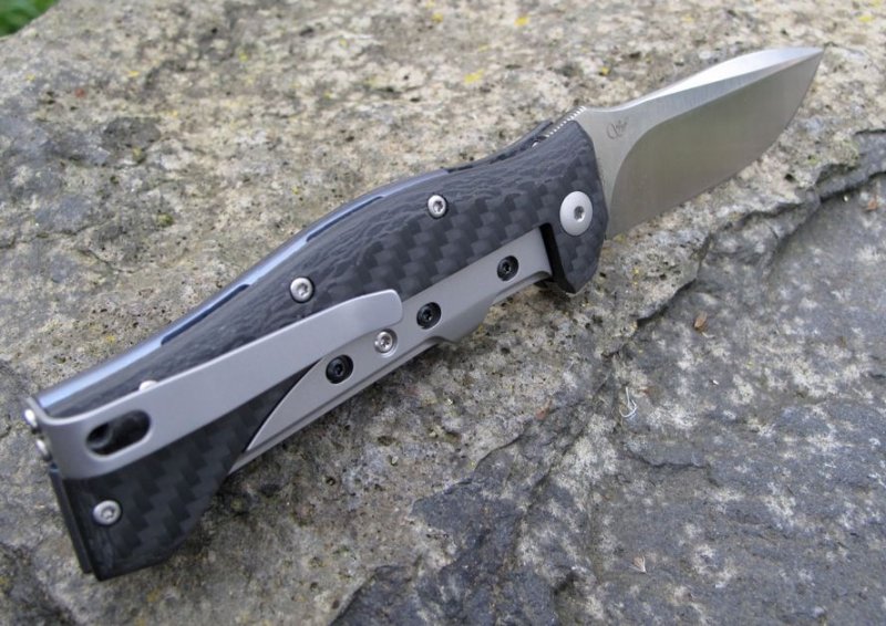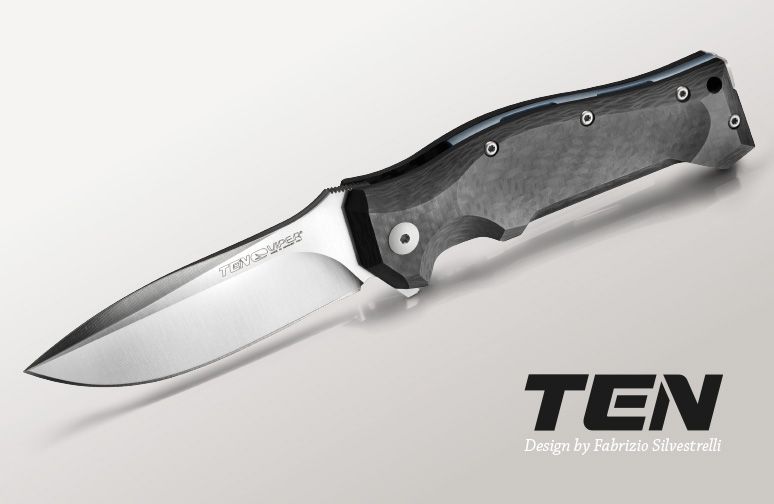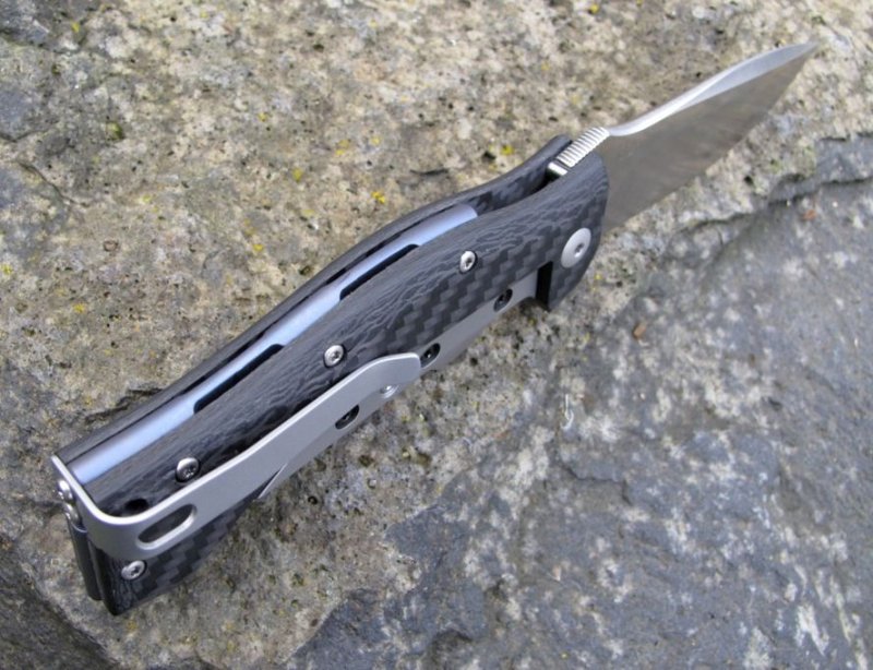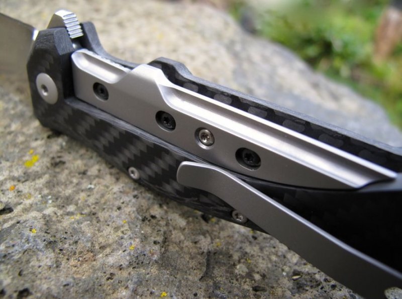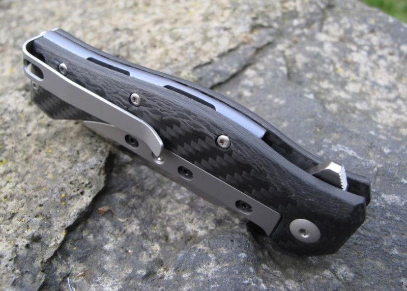 © 2015 Dirk Wanger Das Ten nach dem Design von Fabrizio Silvestrelli besticht nicht nur durch seine aufregende Linienführung und die perfekte Handlage, sondern auch durch eine hochinteressante Bauweise: Die Hybridfeder, die als Weiterentwicklung des Linerlock die Klinge verriegelt, ist zweiteilig aufgebaut. Der eigentliche federnde Teil wird aus Titan gefertigt und trägt vollflächig ein gefrästes Stahl-Overlay, das auch den Kontakt zur Klingenwurzel übernimmt. Durch die einstellbare Verschraubung dieser beiden Komponenten kann auch langfristig eventueller Verschleiß dieser Bauteile kompensiert werden, was ein Garant für maximale Langlebigkeit ohne jede Spur von Klingenspiel ist. Auch das Distanzstück im Griff wird aus dreidimensional gefrästem und blau anodisierten Titan gefertigt. Die satinierte Klinge besteht aus N690Co und wird per Flipper geöffnet. Der umsetzbare Clip (l/r, Tip-up) vervollständigt die Ausstattung. Klingenstahl N690Co Griff Carbon
