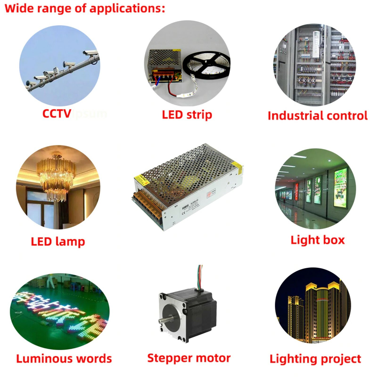 - This IP20 DC 12V switching power supply is widely used for low voltage LED strip light, RGB LED strip.