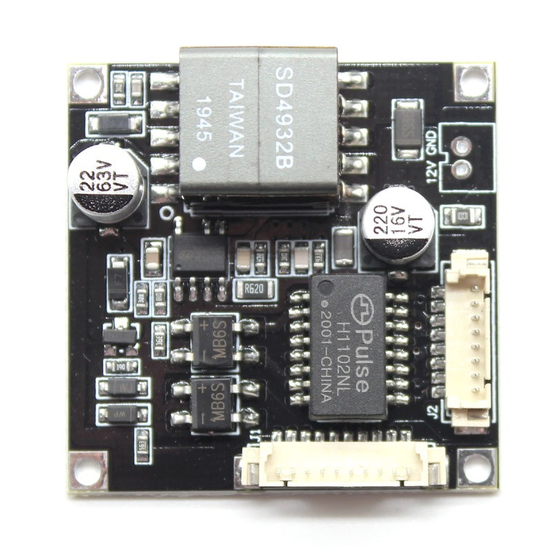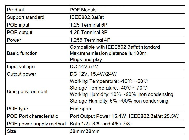 Product: POE module Port rate: 10/100Mbps Input voltage: DC 44V-57V Output power: 12V DC 15.4W/24W IEEE802.3af compliant Support End-span(1,2+/3,6-), and Mid-span(4,5+/7,8-) two mode of power supply The latest AS1138 design, support lightning protection, very stable Dimension: 38mm* 38mm Short-circuit protection 1500V isolation (input to output) 12V, 1A Output supply Simple integration – Plug & Play Low output ripple and noise Working Temperature: -25 degree to 75 degree