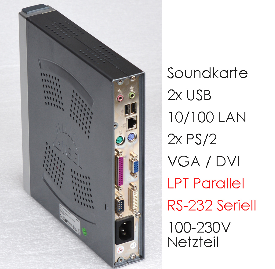 1x LPT (Parallelport), 1x RS-232, 400 MHz CPU, bootfähig v. USB, Schnittstelle für CF-Karte, Soundkarte, 4x USB,