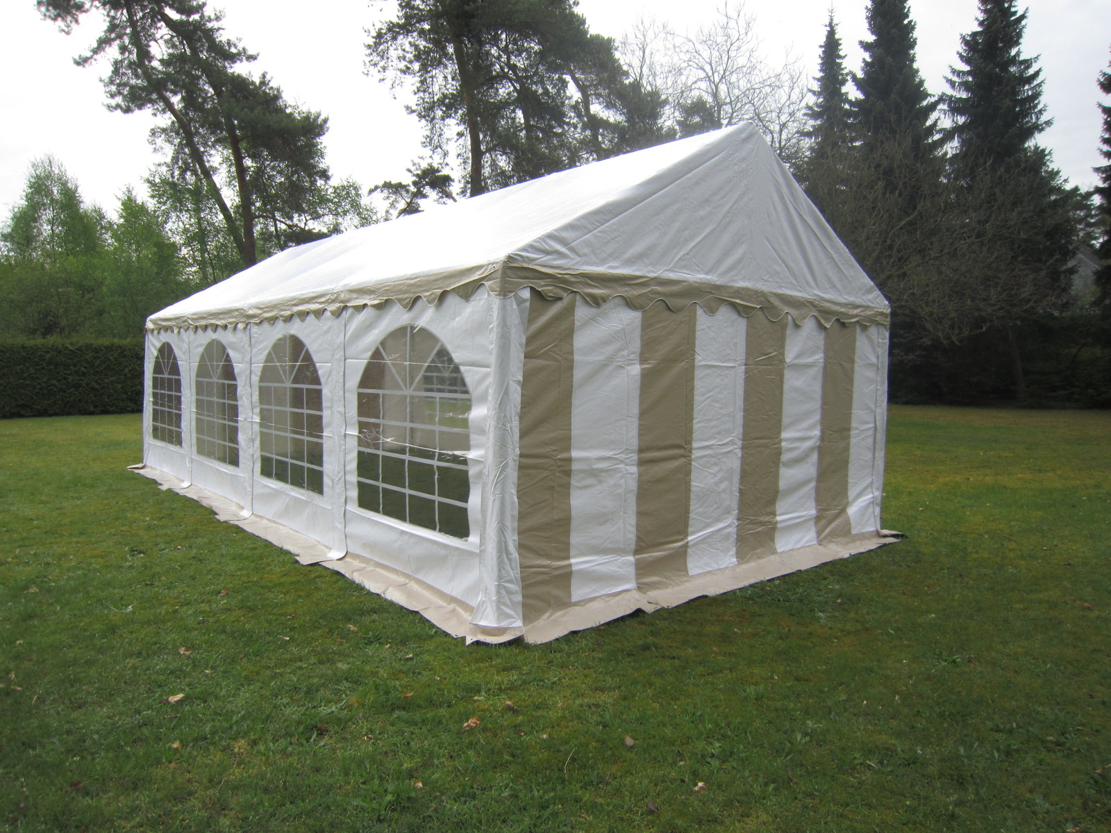Die Spanngurte werden nach Aufbau des Zeltes über das Zeltgestänge gezogen und dann seitlich am Zeltgestänge heruntergezogen. Dann wird der Erdnagel in den Boden geschlagen und abschließend der Spanngurt befestigt und mit der Ratsche fest gezogen.