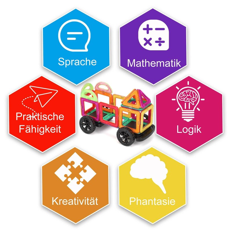 Eigenschaften: 26 Wagen * 6 4D-Karte * 40 Handbuch * 1 Aufbewahrungsbox * 1 2. HOCHWERTIG UND SICHER Hochwertiger ABS-Kunststoff, ungiftig, leicht und frei von gefährlichen scharfen Kanten. Die Magnete sind stark genug, um viele robuste Muster und Formen zu erstellen und beizubehalten. Kit ist kompatibel mit ähnlich großen Blocksätzen. 3. ENTWICKELT MEHRFACHKENNTNISSE Verbessert die Feinmotorik Ihres Kindes Fähigkeiten, Farberkennung, Teamwork, Fantasie und Kreativität. 4.PERFEKTES REISESET Enthält einen Rucksack, der ideal für Reisen oder zum Mitnehmen ist Eile. Eine leicht zu tragende Aufbewahrungstasche hält die Teile zusammen und reduziert Verluste. 5.IDEAL GESCHENK FÜR KINDER Fantastisch für Kinder, aber ein unterhaltsames Set für jedes Alter. Magnetic Building Kit ist ein sehr beliebtes Geschenk. Leicht erweiterbar durch zusätzliche Kits.