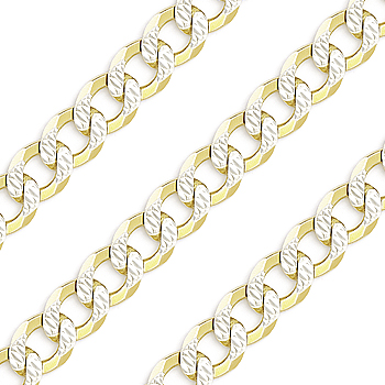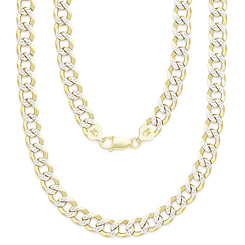The featured Italian-made 5mm chain necklace is cast in .925 sterling silver curb links finished on both sides with diamond-cut pave detailing. The chain is then plated with 14k yellow gold & rhodium & finished with a lobster-claw clasp for secure wear.