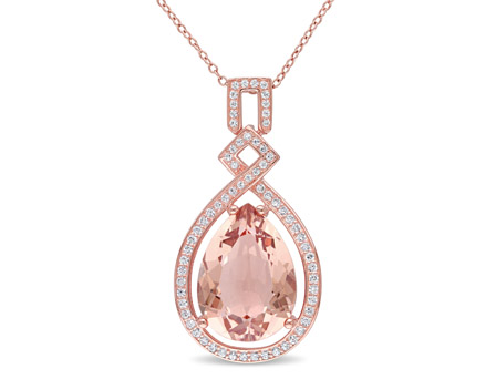 This gorgeous necklace from the Amour Collection features a pear-cut simulated morganite and round-cut cubic zirconia stones set in rose plated silver. This fantastic pendant is hung on a cable chain and is secured with a spring ring clasp.