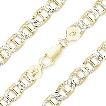 The featured Italian-made 8mm chain necklace is cast in 14k yellow gold plated .925 sterling silver mariner links finished on both sides with diamond-cut pave detailing plated with rhodium then finished with a lobster-claw clasp for secure wear.