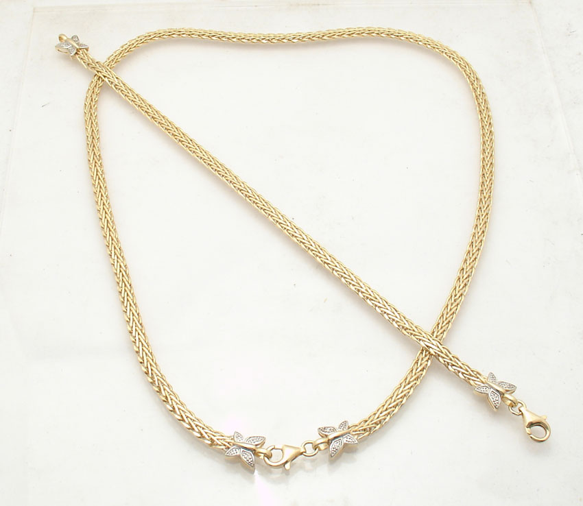 Diamond Accent Wheat Spiga Bracelet Chain Necklace Set with Butterfly End Caps Real 14K Yellow Gold
