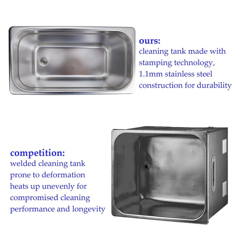 From 3L to 30L volume 304 stainless steel cotainer with reinforced even 1mm thickness inner wall, durable and sturdy to last for years to come; the integrated basket is perfect for keeping the to be cleaned items in place.