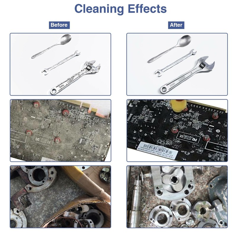 Ultrasonic cleaner uses cavitation bubbles induced by high-frequency pressure (sound) waves to agitate a liquid. The agitation produces high forces on contaminants adhering to substrates like metals, plastics, glass, rubber, and ceramics. This action also penetrates blind holes, cracks, and recesses. The intention is to thoroughly remove all traces of contamination tightly adhering or embedded onto solid surfaces. Water or solvents can be used, depending on the type of contamination and the workpiece. Contaminants can include dust, dirt, oil, pigments, rust, grease, algae, fungus, bacteria, lime scale, polishing compounds, flux agents, fingerprints, soot wax and mold release agents, biological soil like blood, and so on. Ultrasonic can be used for a wide range of workpiece shapes, sizes, and materials, and may not require the part to be disassembled prior .