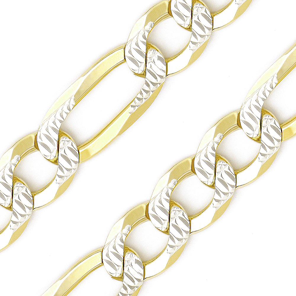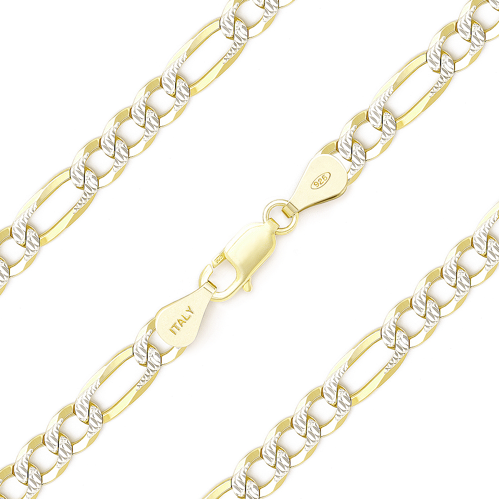 The featured Italian-made 5mm chain necklace is cast in 14k yellow gold plated .925 sterling silver figaro links finished with diamond-cut pave detailing plated with rhodium on both sides of each link. The necklace is then finished with a lobster-claw clasp for secure wear.