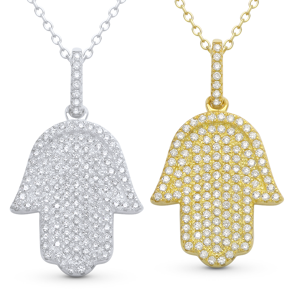 The featured pendants are cast in 925 sterling silver and showcase hamsa hand charms adorned cubic zirconia crystals hand-set on micro pave settings. Each pendant you purchase will include an 18-inch 925 sterling silver chain of matching metal color to dangle them nicely around your neck.