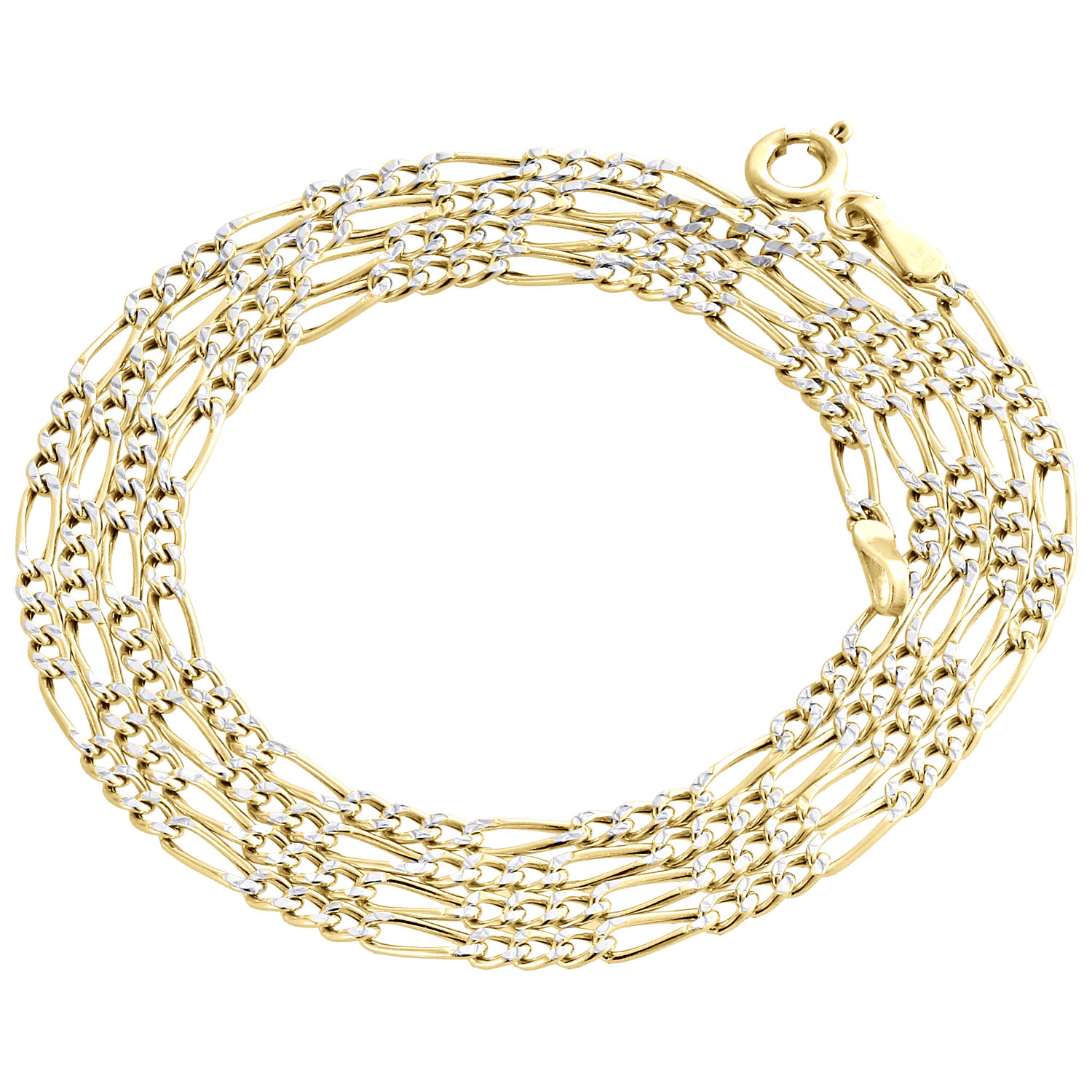 This real Yellow Gold Diamond Cut Hollow Figaro Link chain is presented in 10K gold, finished with a professional bright high polish for extra shine and luster. This chain is 1.90mm wide and is available in different lengths. This chain comes in 16, 18, 20, 22 & 24 inches (check drop down to see which lengths are available in stock). The starting weight is approximately 1.50 grams for 16" necklace. This chain is ideal for wearing with a pendant or wide enough to wear by itself. The chain has a secure Spring Ring so it is easy to put on and take off.