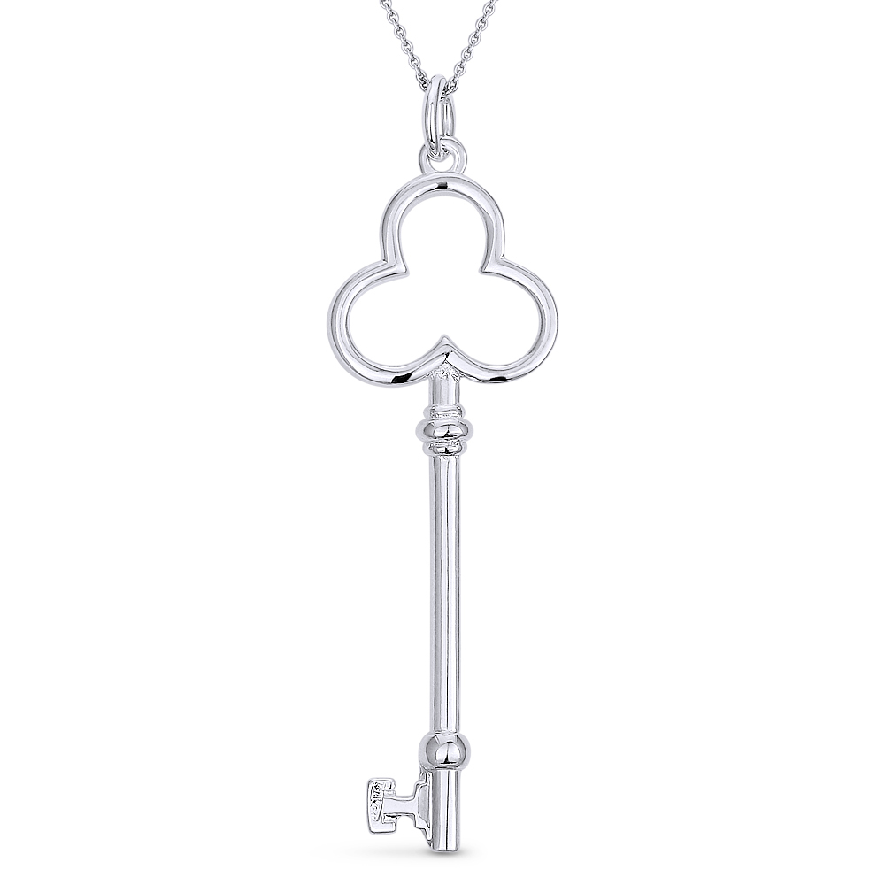 The featured pendant is cast in .925 sterling silver and showcases a key design with a trefoil charm head finished with a sturdy ring bail that can accommodate most chain sizes.