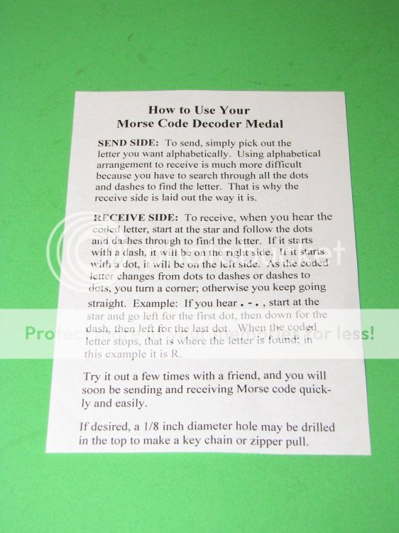 This Morse Code Decoder Medal Coin provides a fun way to teach your children Morse Code or to simply brush up on your own skills. On the Send Side of each Medal, Morse Code is laid out in Alphabetical Order. On the Receive Side is a diagram that helps you to figure out what letter is being sent. Instructions are included. This coin is new. This beautiful coin/medal is made of brass. The medal is approximately 1 1/2 inches in diameter. Lucky winning bidder pays $4.55 for first class shipping.
